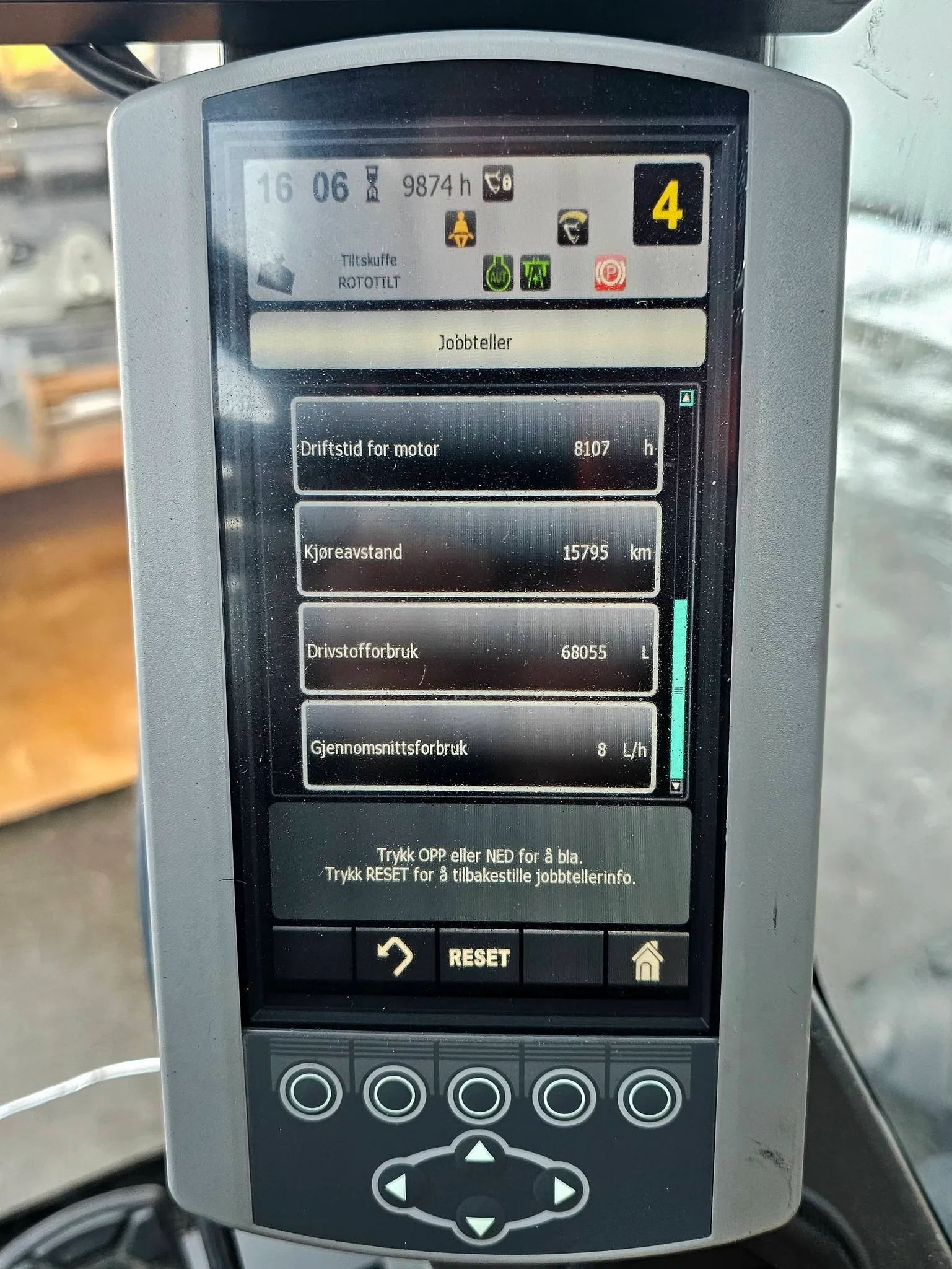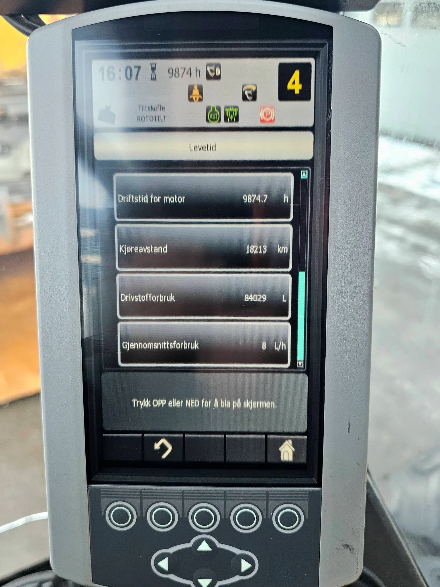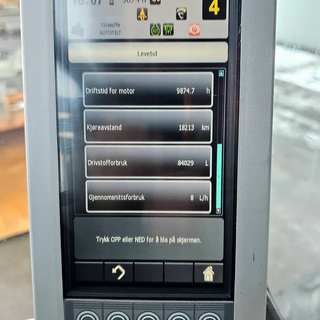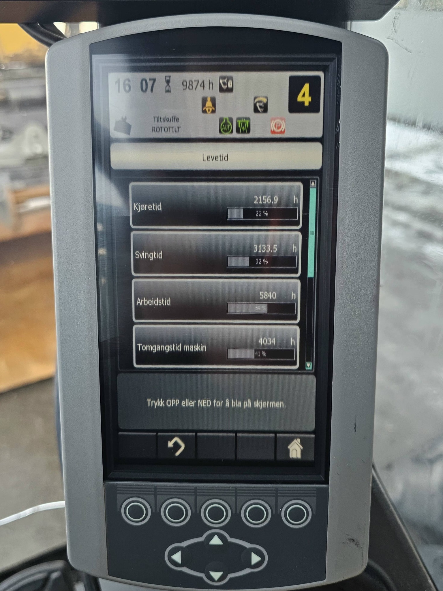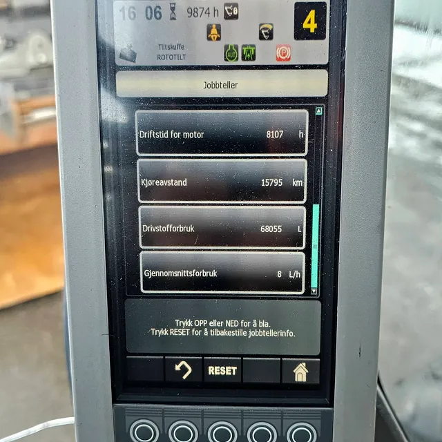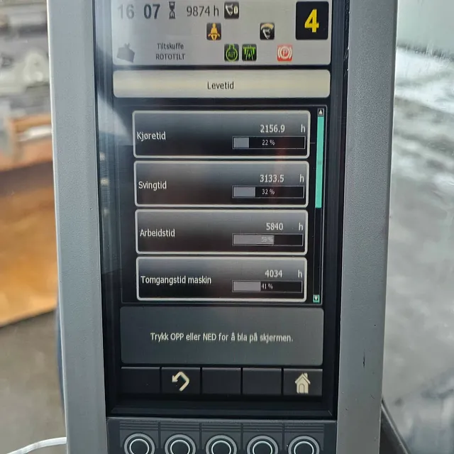 Maskinen har gått 9874 timer, hvor ca. 41 % er tomgangstid.