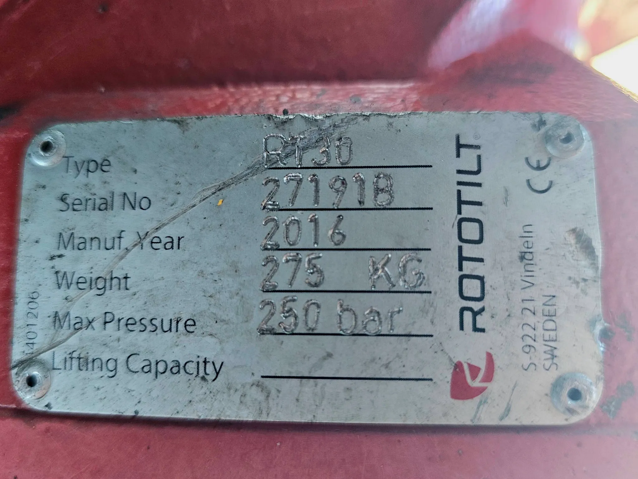 Rototilt RT30, med Hydraulikkuttak